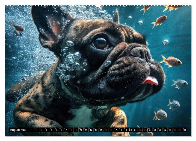 August: Eine Französische Bulldogge taucht mit Fischen