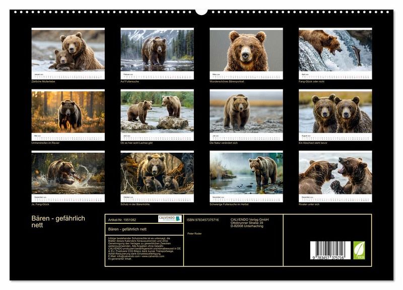 Entdecken Sie die majestätische Welt der Braunbären mit diesem fesselnden Braunbärenkalender. Die liebevoll "Meister Petz" genannten prächtigen Tiere werden in ihren unterschiedlichen Lebenssituationen dargestellt, von verspielten Momenten bis hin zu kraftvollen Auftritten. Bewundern Sie ihr pausbäckiges, liebenswertes Aussehen und ihre wachen Augen, die die Herzen der Menschen weltweit erobern. Ihre imposante Größe erinnert uns an ihren rechtmäßigen Platz in der Wildnis. Der Fotokünstler Peter Roder hat beeindruckende, lebensnahe Ki-Bilder gestaltet und zusammengestellt. Perfekt für Naturliebhaber, Tierfreunde und alle, die die Wildnis bewundern.