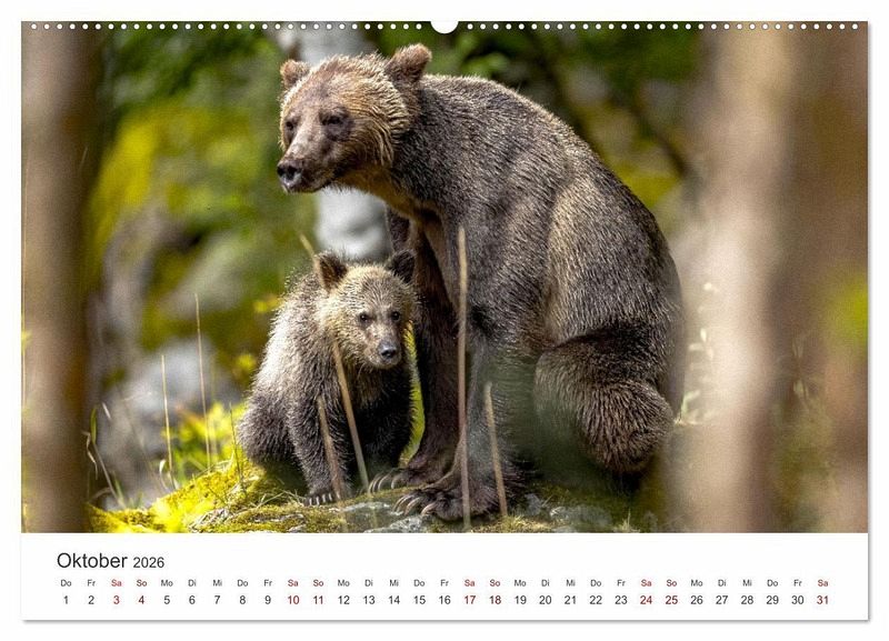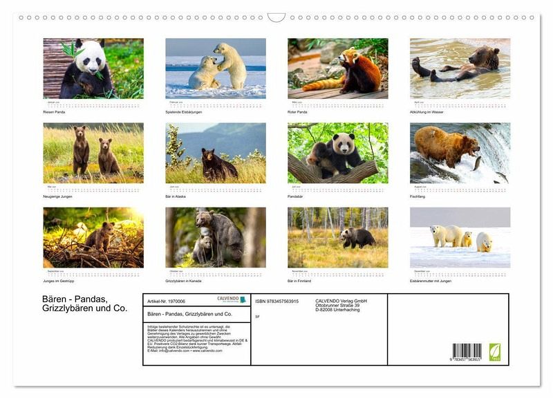 Bären sind zugleich liebenswürdig als auch einschüchternd. Sie sind sehr kräftige und stämmige Tiere. Zur Familie der Bären zählen sowohl Kleinbären wie Großbären. Dieser Kalender widmet sich der beeindruckenden Welt der Großbären. Darunter fallen unter Anderem Eisbären, Grizzlybären und Braunbären. Lassen Sie sich jedes Monat von einem weiteren spektakulärem Motiv überraschen.