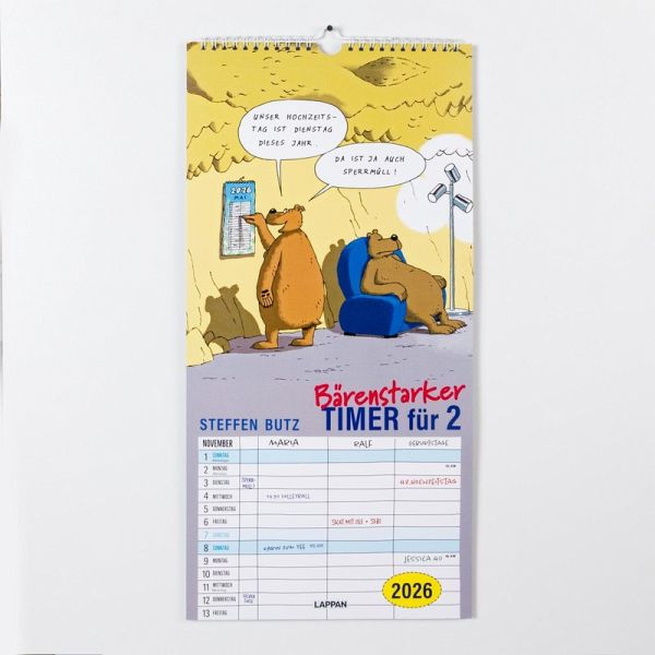 Die witzigen Bären von Steffen Butz sind bekannt für ihre äußerst menschlichen Probleme und haben mittlerweile eine große Fangemeinde gefunden. Die Cartoons in diesem Planer für 2026 sprechen Paaren aus der Seele.