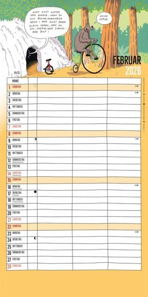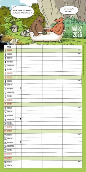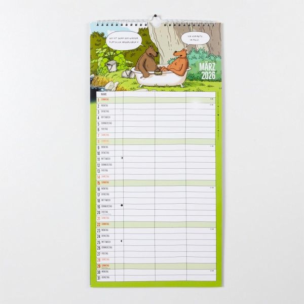 Übersichtlicher Planer mit drei Spalten; sehr stabile Rückwand; 23 x 46 cmJeden Monat ein lustiger Cartoon über den Spalten. Ohne störende Bilder in den SpaltenDickes, umweltfreundliches FSC Papier; leichte Beschreibbarkeit, auch mit Bunt- und BleistiftenDeutsches Kalendarium mit regionalen Feiertagen für Deutschland, Österreich und SchweizFarblich hervorgehobene Sonn- und Feiertage, sowie Anzeige derZeitumstellung