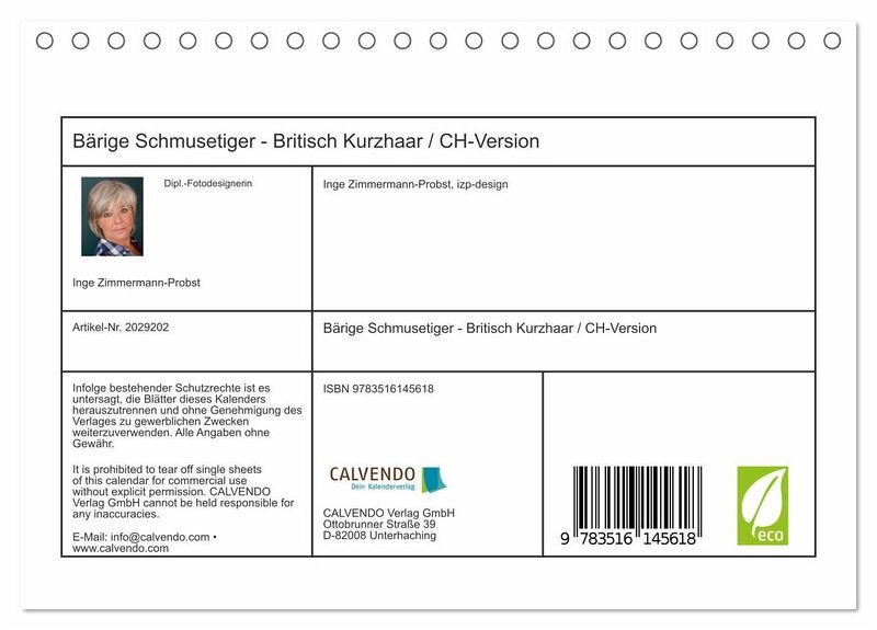Britisch Kurzhaar sind im wahrsten Sinne des Wortes "Bärige Stubentiger". Diese Samtpfoten sind sehr friedfertige, geduldige, liebevolle, anhängliche und gemütliche Tiere. British Kurzhaar sind Rassekatzen, die in verschiedenen Farbvarianten gezüchtet werden. In dem vorliegenden Kalender wird Ihnen das niedliche Geschwisterpaar Balou und Barney vorgestellt. Sie gehören zur Variante der Russian Blue, die u.a. für ihre bernsteinfarbigen Augen bekannt sind. Die Fotodesignerin Inge Zimmermann-Probst hat die kleinen sechs Monate alten Bärchen auf ihren Entdeckungsreisen liebevoll fotografiert. Wunderschöne Fotos von wunderschönen Tieren sind dabei entstanden.