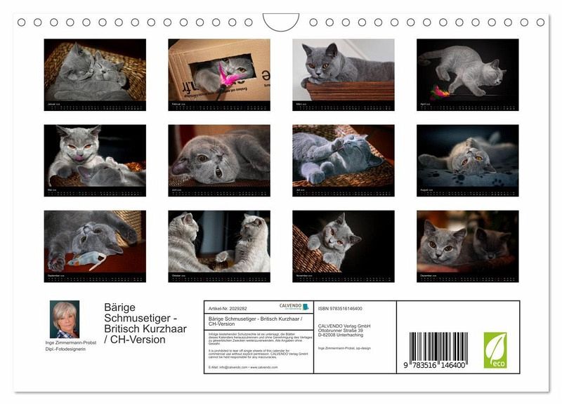 Britisch Kurzhaar sind im wahrsten Sinne des Wortes "Bärige Stubentiger". Diese Samtpfoten sind sehr friedfertige, geduldige, liebevolle, anhängliche und gemütliche Tiere. British Kurzhaar sind Rassekatzen, die in verschiedenen Farbvarianten gezüchtet werden. In dem vorliegenden Kalender wird Ihnen das niedliche Geschwisterpaar Balou und Barney vorgestellt. Sie gehören zur Variante der Russian Blue, die u.a. für ihre bernsteinfarbigen Augen bekannt sind. Die Fotodesignerin Inge Zimmermann-Probst hat die kleinen sechs Monate alten Bärchen auf ihren Entdeckungsreisen liebevoll fotografiert. Wunderschöne Fotos von wunderschönen Tieren sind dabei entstanden.