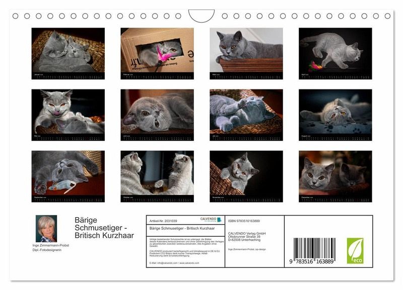 Britisch Kurzhaar sind im wahrsten Sinne des Wortes "Bärige Stubentiger". Diese Samtpfoten sind sehr friedfertige, geduldige, liebevolle, anhängliche und gemütliche Tiere. British Kurzhaar sind Rassekatzen, die in verschiedenen Farbvarianten gezüchtet werden. In dem vorliegenden Kalender wird Ihnen das niedliche Geschwisterpaar Balou und Barney vorgestellt. Sie gehören zur Variante der Russian Blue, die u.a. für ihre bernsteinfarbigen Augen bekannt sind. Die Fotodesignerin Inge Zimmermann-Probst hat die kleinen sechs Monate alten Bärchen auf ihren Entdeckungsreisen liebevoll fotografiert. Wunderschöne Fotos von wunderschönen Tieren sind dabei entstanden.