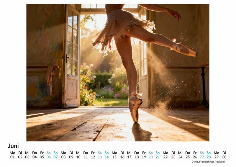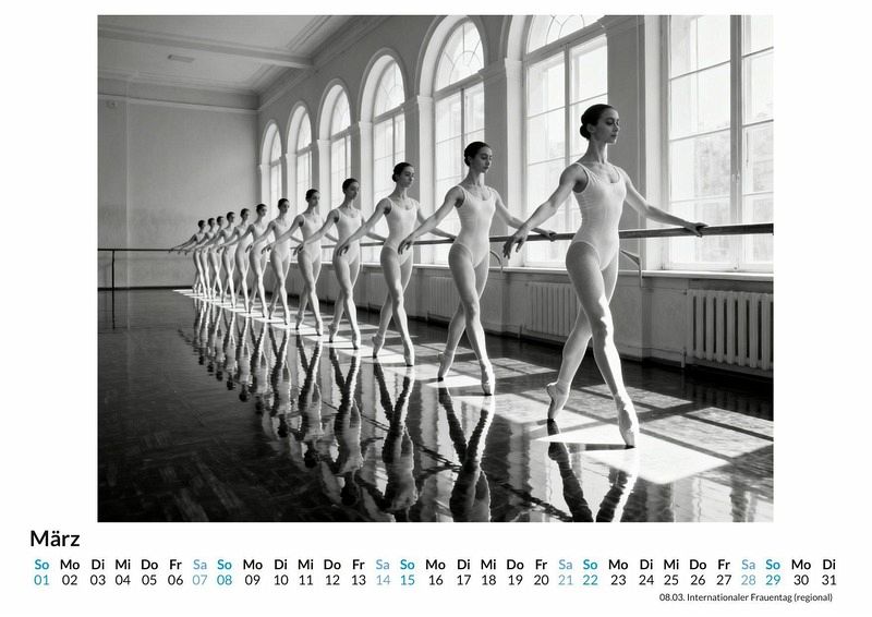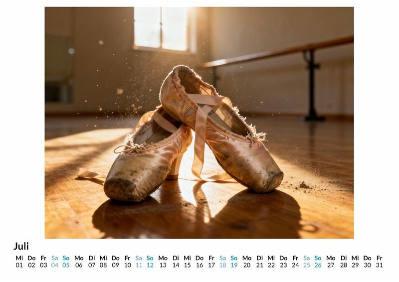 Hinter dem Vorhang, wo Disziplin auf Anmut trifft und jeder einzelne Schritt zählt, beginnt die faszinierende Magie des Balletts. Der Kalender "Ballett-Impressionen" fängt diese besonderen Momente ein und begleitet den Betrachter von der konzentrierten Stille im Probensaal bis zum verdienten, strahlenden Applaus auf der großen Bühne. Dieser Kalender ist eine ideale Wahl: * Für alle, die die Eleganz und Ästhetik des Tanzes schätzen. * Für Tänzerinnen und Tänzer, die ihre Leidenschaft das ganze Jahr über erleben möchten. * Für Liebhaber der darstellenden Künste, die einen Blick hinter die Kulissen werfen wollen. Jedes Monatsblatt enthüllt eine neue Facette dieser kunstvollen Welt. Die Motive zeigen die greifbare Spannung vor dem Auftritt, die Schwerelosigkeit fließender Bewegungen während einer Pirouette und die tiefe, emotionale Verbindung zwischen den Tanzpartnern. Diese Szenen wurden nicht durch eine herkömmliche Kameralinse eingefangen, sondern durch das Zusammenspiel von kreativen Impulsen und komplexen Algorithmen zum Leben erweckt. So entstehen einzigartige visuelle Kompositionen, die die Dynamik und Grazie des Tanzes auf eine neue Art interpretieren. Was der Kalender bietet: * Zwölf sorgfältig komponierte Monatsmotive. * Ein stilvoller Begleiter durch das gesamte Jahr. * Ein dekoratives Element für Zuhause oder das Büro. Der Kalender "Ballett-Impressionen" ist eine Hommage an die unermüdliche Hingabe und die vergängliche Schönheit des Tanzes. Er ist eine Einladung, die Poesie der Bewegung Monat für Monat neu zu entdecken und sich von der stillen Ausdruckskraft des Balletts das ganze Jahr über inspirieren zu lassen.