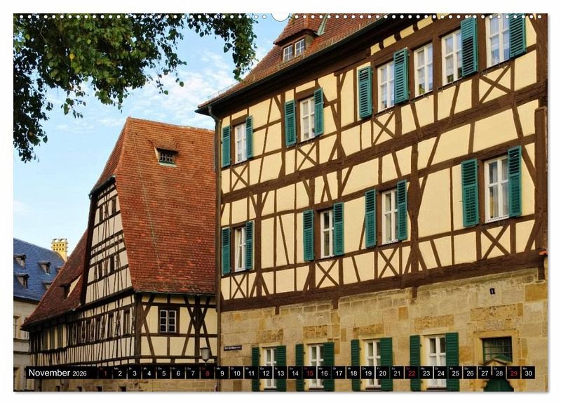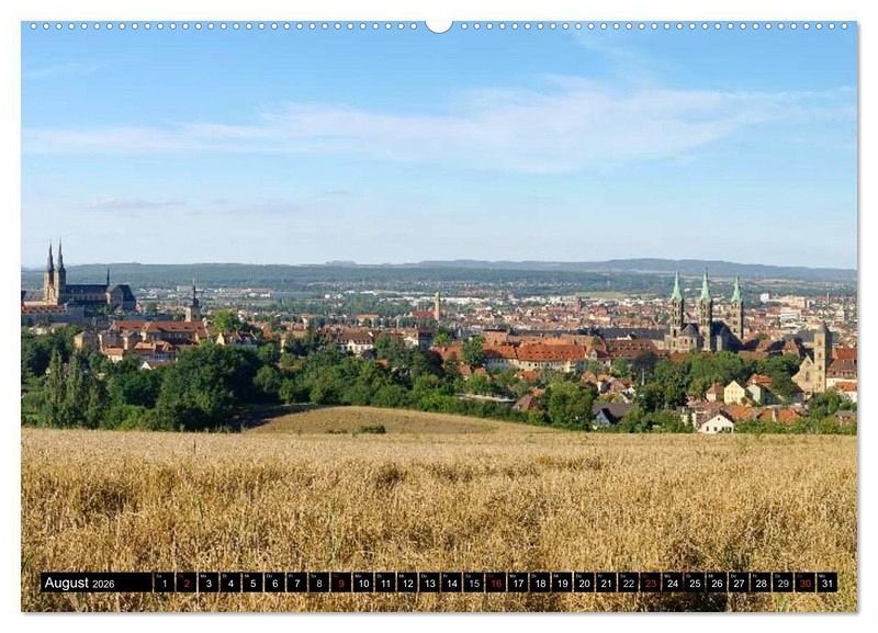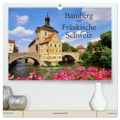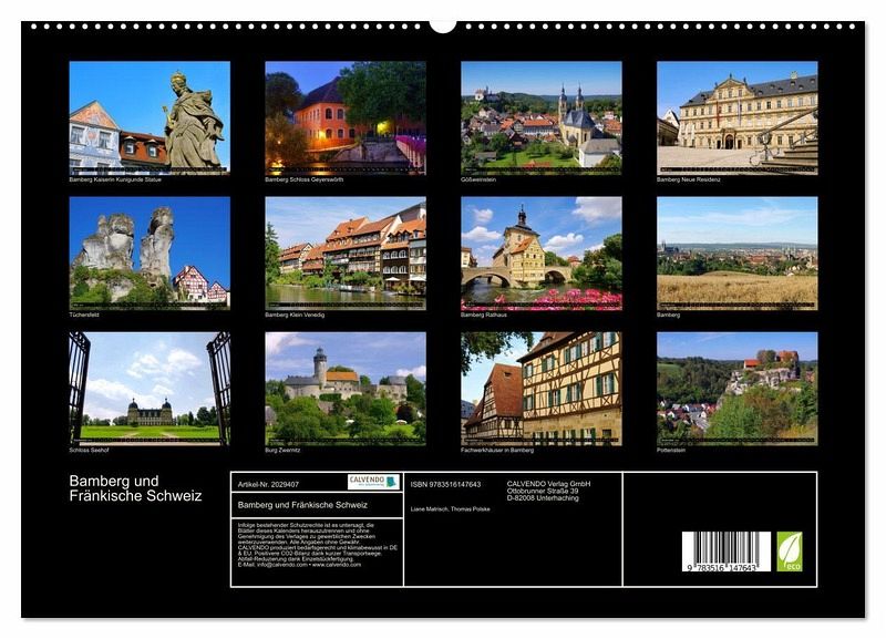 Der Kalender zeigt Sehenswürdigkeiten in Bamberg und der Fränkischen Schweiz. Aufnahmen aus Gößweinstein, dem Felsendorf Tüchersfeld und vielen historischen Gebäuden aus der alten Stadt Bamberg begleiten sie durch das Jahr.