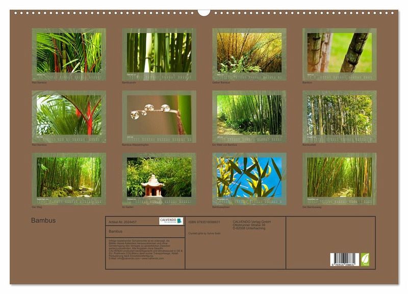 QUALITÄT - Hochwertiger Fotokalender mit 12 wunderschönen Motiven auf lichtbeständigem Bilderdruckpapier, robuste Spiralbindung mit Aufhängebügel.NACHHALTIG - deutliche Abfallreduzierung durch bedarfsgerechte Einzelstückfertigung, umweltfreundliches FSC-zertifiziertes Papier, Produktion in Deutschland, klimabewusste Logistik.PERFEKTES GESCHENK - Kalender für Freunde und Familie, für Kinder und Erwachsene, jung und alt, zu Weihnachten, Geburtstag oder zwischendurch.VIELFALT - Bildkalender in verschiedenen Formaten, z.B. DIN A5, DIN A4, DIN A3 sowie DIN A2. Ob Naturmotiv, Gemälde oder Fotos, ideal für ein persönliches Wohlfühlambiente.Die Welt des Bambus von Autor(in): CrystalLights by Sylvia Seibl