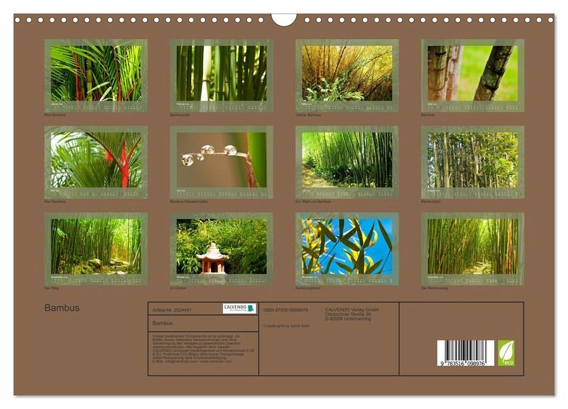 QUALITÄT - Hochwertiger Fotokalender mit 12 wunderschönen Motiven auf lichtbeständigem Bilderdruckpapier, robuste Spiralbindung mit Aufhängebügel.NACHHALTIG - deutliche Abfallreduzierung durch bedarfsgerechte Einzelstückfertigung, umweltfreundliches FSC-zertifiziertes Papier, Produktion in Deutschland, klimabewusste Logistik.PERFEKTES GESCHENK - Kalender für Freunde und Familie, für Kinder und Erwachsene, jung und alt, zu Weihnachten, Geburtstag oder zwischendurch.VIELFALT - Bildkalender in verschiedenen Formaten, z.B. DIN A5, DIN A4, DIN A3 sowie DIN A2. Ob Naturmotiv, Gemälde oder Fotos, ideal für ein persönliches Wohlfühlambiente.Die Welt des Bambus von Autor(in): CrystalLights by Sylvia Seibl