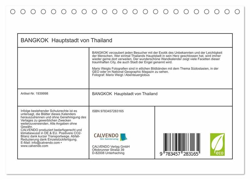 BANGKOK verzaubert jeden Besucher mit der Exotik des Unbekannten und der Leichtigkeit der Menschen. Wer einmal Thailands Hauptstadt in sein Herz geschlossen hat, wird immer wieder gerne dort verweilen. Der wunderschöne Wandkalender zeigt viele Facetten dieser traumhaften City, die auch Stadt der Engel genannt wird.