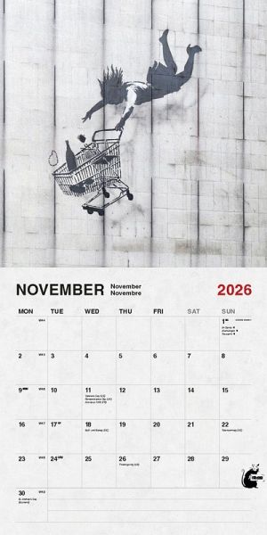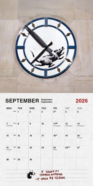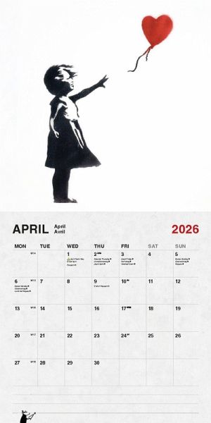 Der neue Banksy Kalender zeigt wieder einmal obskur, grotesk, humorvoll und gern auch zynisch die Themen der Welt aus der Sicht des legendären Street Art Graffiti Künstlers. Der Kalender ist u.a. in deutscher Sprache und mit allen gesetzlichen und religiösen Feiertagen für das neue Jahr 2026. Der Kalender enthält zudem ein breites Nutzkalendarium zum Eintragen von eigenen Terminen, Geburtstagen und Notizen. Inklusive einem XXL Banksy Poster!