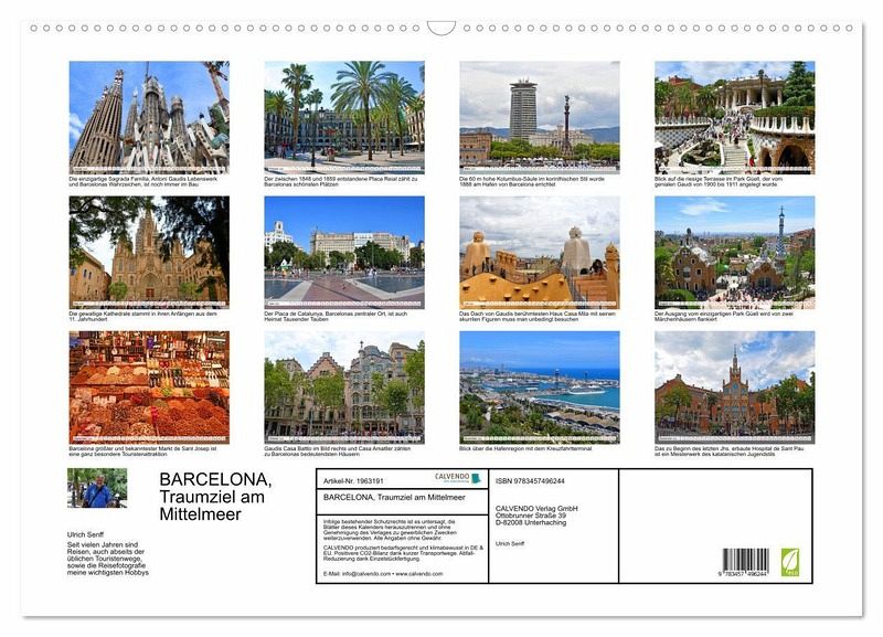 Kataloniens Hauptstadt mit seinen einzigartigen Baudenkmälern wie Sagrada Familia, Casa Mila, Park Güell, La Cathedral, um nur einige zu nennen, zählt zu den großartigsten Touristenzielen dieser Erde. Darüber hinaus wird das Gesicht dieser Millionenmetropole von einem der genialsten Architekten der Menschheitsgeschichte geprägt. Im Kalender präsentiert der Autor einige seiner wunderschönen Bilder.