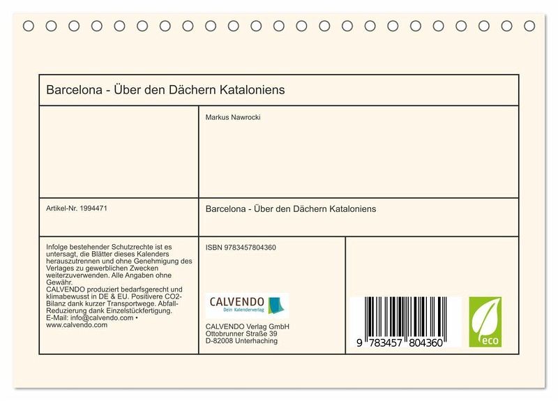 QUALITÄT - Hochwertiger Fotokalender mit 12 wunderschönen Motiven auf lichtbeständigem Bilderdruckpapier, robuste Spiralbindung.NACHHALTIG - deutliche Abfallreduzierung durch bedarfsgerechte Einzelstückfertigung, umweltfreundliches FSC-zertifiziertes Papier, Produktion in Deutschland, klimabewusste Logistik.PERFEKTES GESCHENK - Kalender für Freunde und Familie, für Kinder und Erwachsene, jung und alt, zu Weihnachten, Geburtstag oder zwischendurch.VIELFALT - Bildkalender in verschiedenen Formaten, z.B. DIN A5, DIN A4, DIN A3 sowie DIN A2. Ob Naturmotiv, Gemälde oder Fotos, ideal für ein persönliches Wohlfühlambiente.Die schönsten Aussichtspunkte über Barcelona von Autor(in): Markus Nawrocki