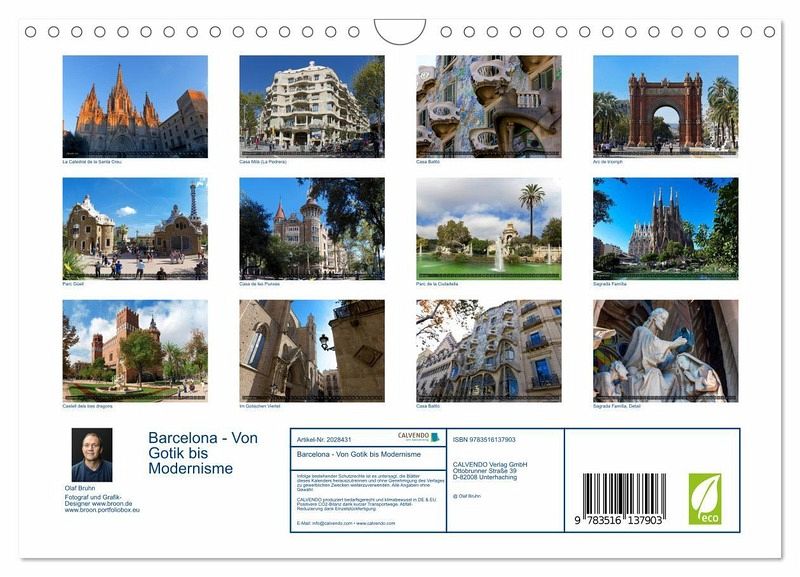 QUALITÄT - Hochwertiger Fotokalender mit 12 wunderschönen Motiven auf lichtbeständigem Bilderdruckpapier, robuste Spiralbindung mit Aufhängebügel.NACHHALTIG - deutliche Abfallreduzierung durch bedarfsgerechte Einzelstückfertigung, umweltfreundliches FSC-zertifiziertes Papier, Produktion in Deutschland, klimabewusste Logistik.PERFEKTES GESCHENK - Kalender für Freunde und Familie, für Kinder und Erwachsene, jung und alt, zu Weihnachten, Geburtstag oder zwischendurch.VIELFALT - Bildkalender in verschiedenen Formaten, z.B. DIN A5, DIN A4, DIN A3 sowie DIN A2. Ob Naturmotiv, Gemälde oder Fotos, ideal für ein persönliches Wohlfühlambiente.12 hochauflösende Barcelona-Fotografien von Olaf Bruhn. von Autor(in): Olaf Bruhn