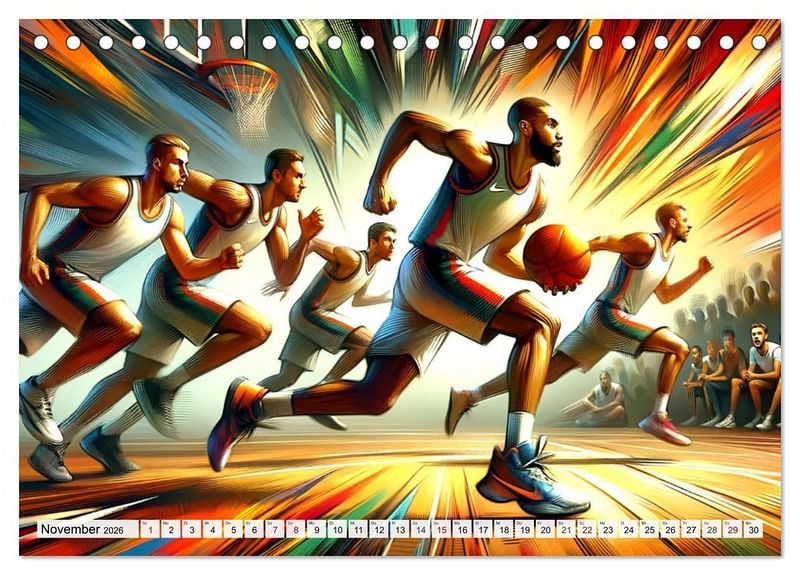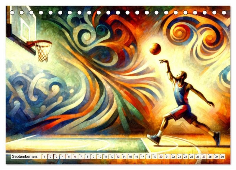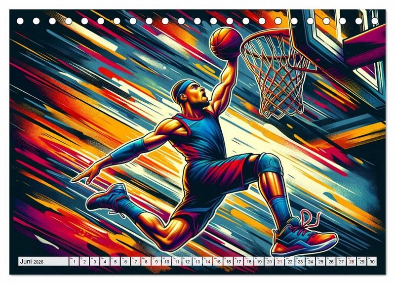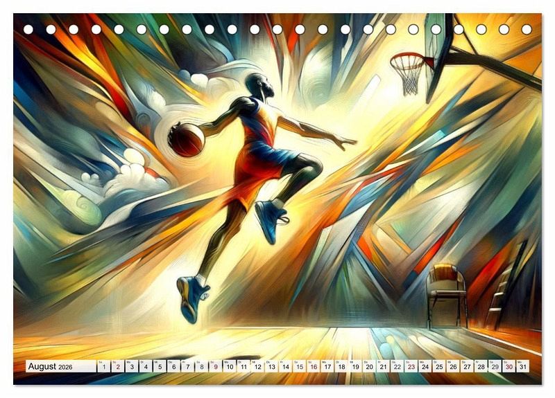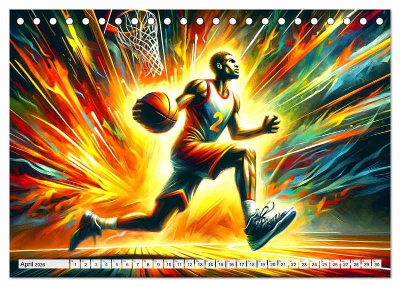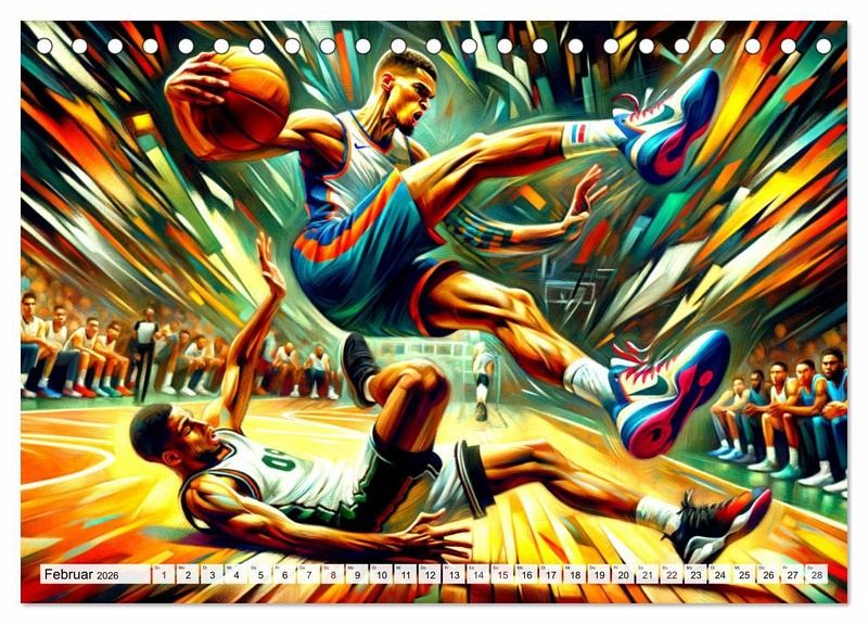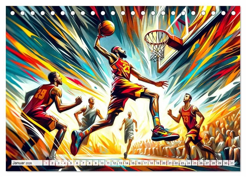 Tauchen Sie ein in "Basketball Expressionismus", wo dynamische Momente des Spiels in farbenfrohen, expressionistischen Bildern zum Leben erwachen. Jedes Kunstwerk fängt Energie, Leidenschaft und Bewegung ein, um die Höhepunkte des Basketballs in einer künstlerischen Darstellung zu zelebrieren. Entdecken Sie kraftvolle Dunks, elegante Korbleger und strategische Spielzüge, dargestellt mit einer Palette, die die Emotionen des Sports einfängt. Ein Kalender für alle, die die Schönheit des Basketballs und die Kraft der Kunst schätzen.