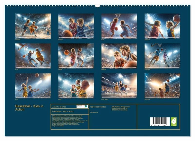 Erlebe die Faszination des Basketballs das ganze Jahr über! Unser exklusiver Basketballkalender zeigt in beeindruckenden Illustrationen den Teamgeist, die Energie und den unbändigen Willen junger Talente auf dem Spielfeld. Jeder Monat fängt einen Moment voller Emotionen ein, vom entscheidenden Wurf bis zum kämpferischen Dribbling. Perfekt für alle, die Sport, Dynamik und Motivation lieben. Ob im Kinderzimmer, Büro oder Vereinsheim, dieser Kalender erinnert täglich daran, was Leidenschaft, Fairplay und Teamwork bedeuten. Ein ideales Geschenk für kleine und große Basketballfans, Trainer oder Eltern, die den Spirit des Spiels leben. Lass dich inspirieren, Monat für Monat, Spielzug für Spielzug. Erstellt wurden die Illustrationen mit KI und Photoshop.