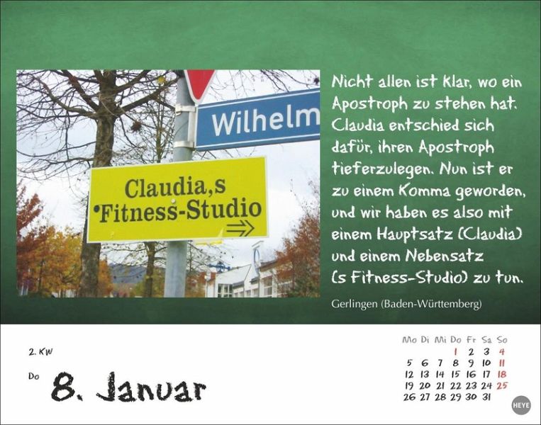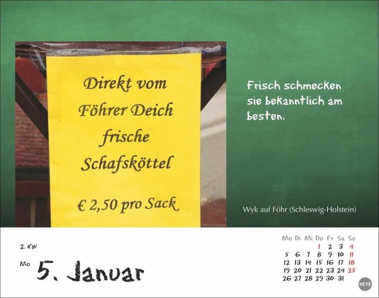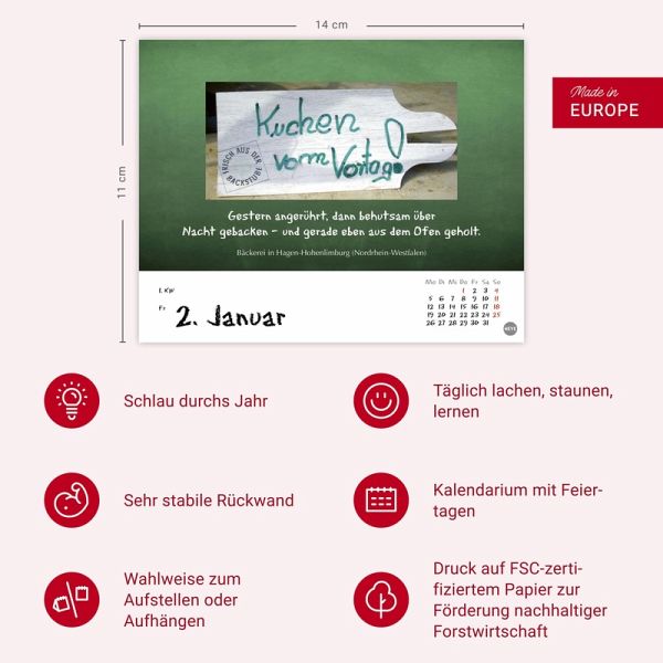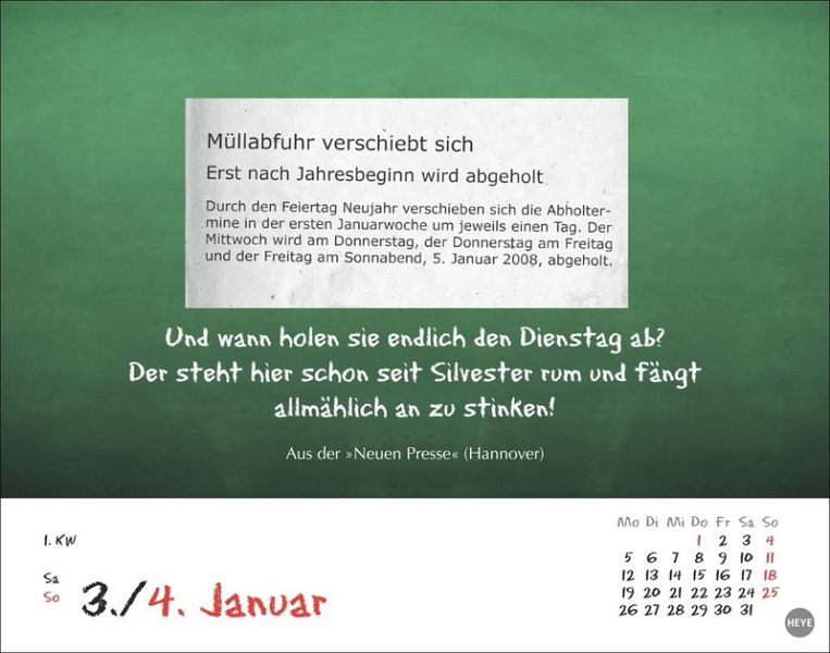 - Bastian Sick kommentiert peinliche Sprachpannen zum Schreien komisch: ein witziger Kalender-Bestseller vom Autor des kongenialen "Der Dativ ist dem Genitiv sein Tod" - Täglich neue unbeabsichtigte Sprachmissgeschicke, urkomische Wortverdreher und amüsante Fehlschreibungen- Bastian Sicks kurioseste Fundstücke, versammelt im Abreißkalender 2026- Handliche 14 x 11 cm, die überall Platz finden, wo ein Lachen gebraucht wird: Flexibel nutzbar als Kalender zum Abreißen für die Wand oder als Aufstellkalender- Der beste Garant für die tägliche Dosis Humor: Tageskalender von Heye im Athesia Kalenderverlag- Jeder Wochentag ein Kalenderblatt, Samstag/Sonntag auf einem Blatt.