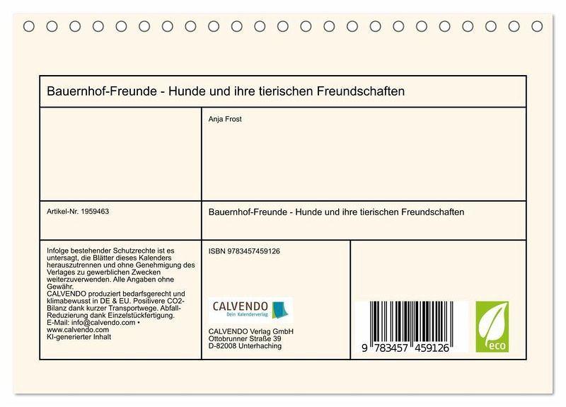 QUALITÄT - Hochwertiger Fotokalender mit 12 wunderschönen Motiven auf lichtbeständigem Bilderdruckpapier, robuste Spiralbindung.NACHHALTIG - deutliche Abfallreduzierung durch bedarfsgerechte Einzelstückfertigung, umweltfreundliches FSC-zertifiziertes Papier, Produktion in Deutschland, klimabewusste Logistik.PERFEKTES GESCHENK - Kalender für Freunde und Familie, für Kinder und Erwachsene, jung und alt, zu Weihnachten, Geburtstag oder zwischendurch.VIELFALT - Bildkalender in verschiedenen Formaten, z.B. DIN A5, DIN A4, DIN A3 sowie DIN A2. Ob Naturmotiv, Gemälde oder Fotos, ideal für ein persönliches Wohlfühlambiente.Ein abwechslungsreichess Hundeleben auf dem Bauernhof von Autor(in): Anja Frost