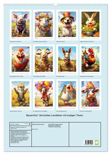 QUALITÄT - Hochwertiger Fotokalender mit 12 wunderschönen Motiven auf lichtbeständigem Bilderdruckpapier, robuste Spiralbindung mit Aufhängebügel.NACHHALTIG - deutliche Abfallreduzierung durch bedarfsgerechte Einzelstückfertigung, umweltfreundliches FSC-zertifiziertes Papier, Produktion in Deutschland, klimabewusste Logistik.PERFEKTES GESCHENK - Kalender für Freunde und Familie, für Kinder und Erwachsene, jung und alt, zu Weihnachten, Geburtstag oder zwischendurch.VIELFALT - Bildkalender in verschiedenen Formaten, z.B. DIN A5, DIN A4, DIN A3 sowie DIN A2. Ob Naturmotiv, Gemälde oder Fotos, ideal für ein persönliches Wohlfühlambiente.Auf dem farbenprächtigen Fantasy-Bauernhof ist immer viel los! von Autor(in): Rose Hurley