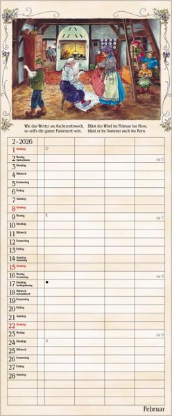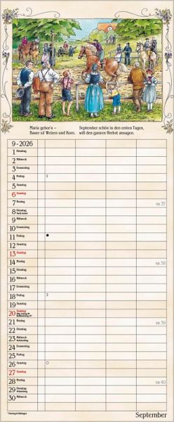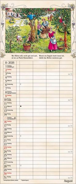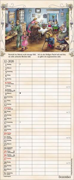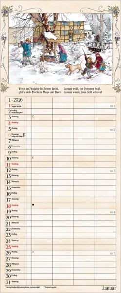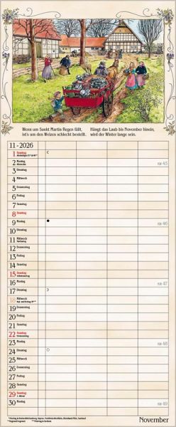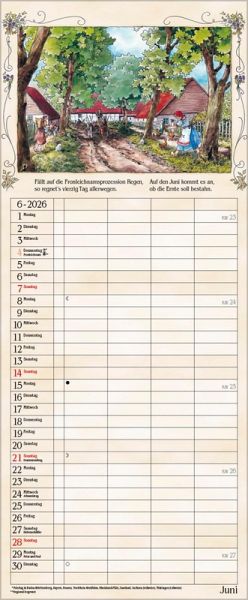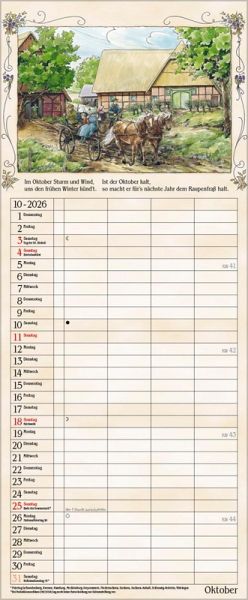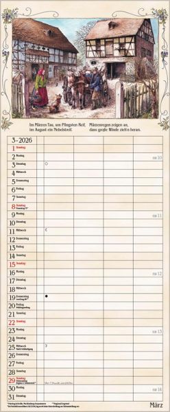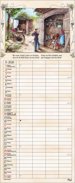 Dieser Planer fügt sich nahtlos in jede gemütlich-rustikale Umgebung ein. Mit nostalgischen Bildern von Christa Versley, Bauernregeln und vier Spalten. Neben dem gesamten Kalenderjahr enthält der Wandplaner auch eine Vorschau bis März des Folgejahres.