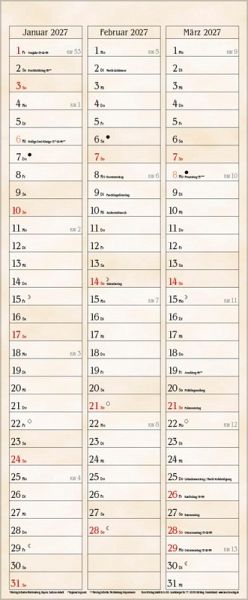 Übersichtlicher Familienplaner für bis zu 4 Personen; sehr stabile Rückwand; 19 x 46 cm Jeden Monat eine süße Zeichnung über den Spalten. Ohne störende Bilder in den Spalten Dickes, umweltfreundliches FSC Papier; leichte Beschreibbarkeit, auch mit Bunt- und Bleistiften Deutsches Kalendarium mit regionalen Feiertagen für Deutschland, Österreich und Schweiz Farblich hervorgehobene Sonn- und Feiertage, sowie Anzeige der Zeitumstellung