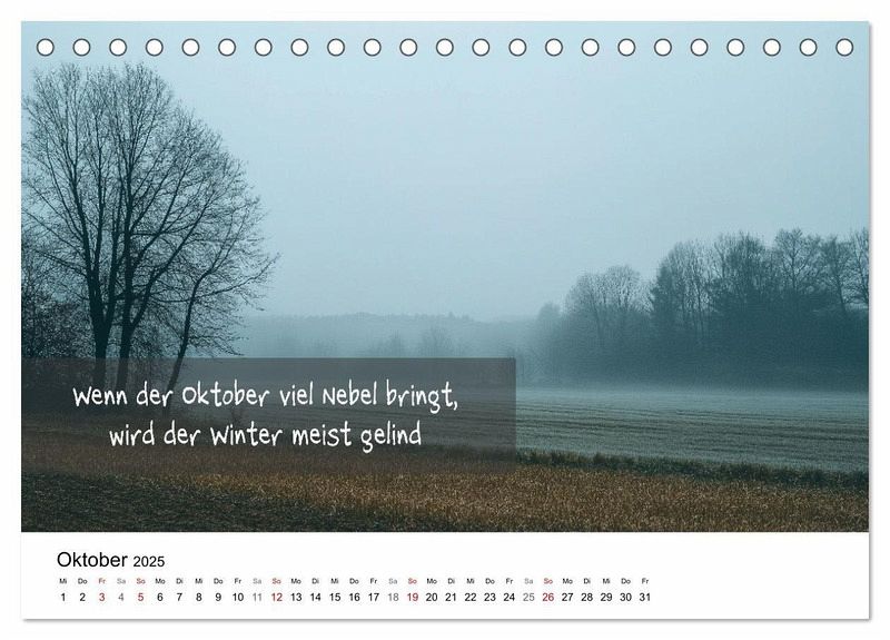 Erleben Sie die Weisheit alter Bauernregeln neu interpretiert in einem einzigartigen Kalender. Lassen Sie sich Monat für Monat von wunderschönen Landschaften und passenden Bauernregeln begleiten, die traditionelles Wissen und natürliche Schönheit vereinen. Dieser Kalender ist nicht nur eine perfekte Dekoration für Ihr Zuhause oder Büro, sondern auch eine wunderbare Geschenkidee für alle, die sich für Natur, Jahreszeiten und Traditionen begeistern. Von frostigen Winterlandschaften über blühende Frühlingswiesen bis hin zu goldenen Herbstfeldern ¿ jede Seite des Kalenders fängt die jeweilige Stimmung des Monats auf beeindruckende Weise mit KI generierten Bildern ein. Holen Sie sich ein Stück ländliche Weisheit ins Haus und entdecken Sie den ¿Rhythmus der Jahreszeiten¿ mit jedem Umblättern. Hochwertiger Tischkalender zum Aufstellen mit 12 wunderschönen Bildern. Unsere Umwelt liegt uns am Herzen. Daher verwenden wir ausschließlich FSC-zertifizierte Papiere aus verantwortungsvoller Waldwirtschaft. Wir vermeiden Überproduktion und somit deutliche Abfallmengen, da wir bedarfsgerecht in Einzelfertigung in Deutschland (Made in Germany) produzieren. Wir halten unsere Transportwege kurz und sorgen für eine klimabewusste Logistik. 14 Seiten bestehend aus 1 Cover 12 Monatsseiten 1 Indexseite Papprücken mit Aufstellerfunktion. Abbildungen: Januar: Regen im Januar ¿ ein Zeichen für frühes Frühjahr Februar: Kalte Februartage ¿ der Frühling wartet nicht lange März: März die Felder überflutet, freut sich der Bauer auf Ernte April: Aprilwetter ¿ voller Überraschungen und ständiger Wechsel Mai: Warmer Regen im Mai bringt reichlich Segen für das Jahr Juni: Ein kühler und nasser Juni sichert Vorräte für den Winter Juli: Im Juli reifen die Felder, der Bauer gönnt sich Ruhe August: Trockener August ¿ eine Dürre im Anmarsch September: Schöne Septembertage versprechen einen langen Herbst Oktober: Nebel im Oktober ¿ ein milder Winter steht bevor November: Ein kalter Novembertag verheißt ein fruchtbares Jahr Dezember: Dezember mit Schnee ¿ Korn wird in Fülle gedeihen QUALITÄT - Hochwertiger Fotokalender mit 12 wunderschönen Motiven auf lichtbeständigem Bilderdruckpapier, robuste Spiralbindung. NACHHALTIG - deutliche Abfallreduzierung durch bedarfsgerechte Einzelstückfertigung, umweltfreundliches FSC-zertifiziertes Papier, Produktion in Deutschland, klimabewusste Logistik. PERFEKTES GESCHENK ¿ Kalender für Freunde und Familie, für Kinder und Erwachsene, jung und alt, zu Weihnachten, Geburtstag oder zwischendurch. VIELFALT ¿ Bildkalender in verschiedenen Formaten, z.B. DIN A5, DIN A4, DIN A3 sowie DIN A2. Ob Naturmotiv, Gemälde oder Fotos, ideal für ein persönliches Wohlfühlambiente. Dieser wunderschöne Kalender führt Sie Monat für Monat mit traditionellen Bauernregeln durch das Jahr. Jede Regel wird durch stimmungsvolle Landschaftsbilder ergänzt, die die verschiedenen Jahreszeiten in all ihrer Prach von Autor(in): Michael Bihlmayer