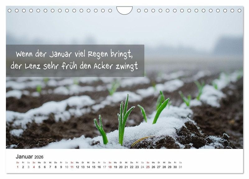 Erleben Sie die Weisheit alter Bauernregeln neu interpretiert in einem einzigartigen Kalender. Lassen Sie sich Monat für Monat von wunderschönen Landschaften und passenden Bauernregeln begleiten, die traditionelles Wissen und natürliche Schönheit vereinen. Dieser Kalender ist nicht nur eine perfekte Dekoration für Ihr Zuhause oder Büro, sondern auch eine wunderbare Geschenkidee für alle, die sich für Natur, Jahreszeiten und Traditionen begeistern. Von frostigen Winterlandschaften über blühende Frühlingswiesen bis hin zu goldenen Herbstfeldern - jede Seite des Kalenders fängt die jeweilige Stimmung des Monats auf beeindruckende Weise mit KI generierten Bildern ein. Holen Sie sich ein Stück ländliche Weisheit ins Haus und entdecken Sie den "Rhythmus der Jahreszeiten" mit jedem Umblättern.