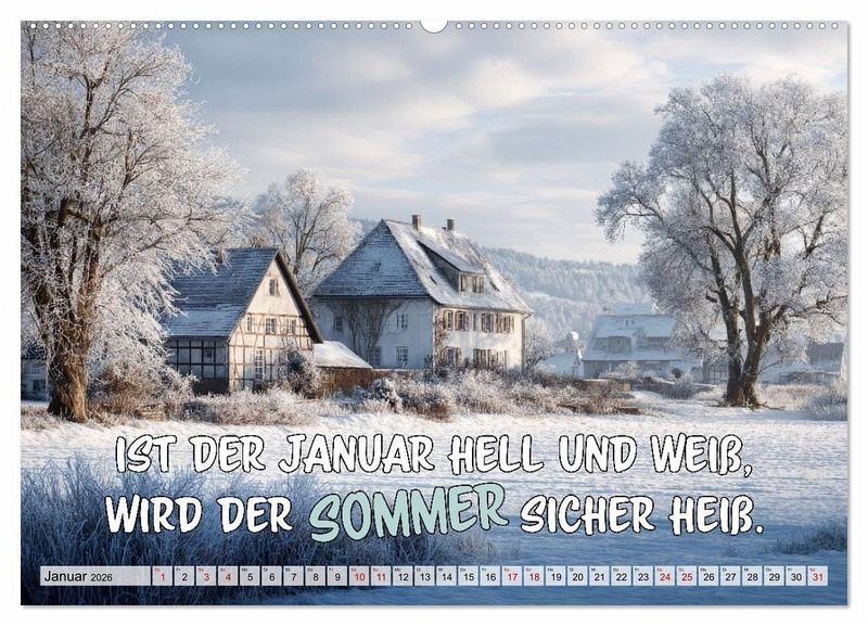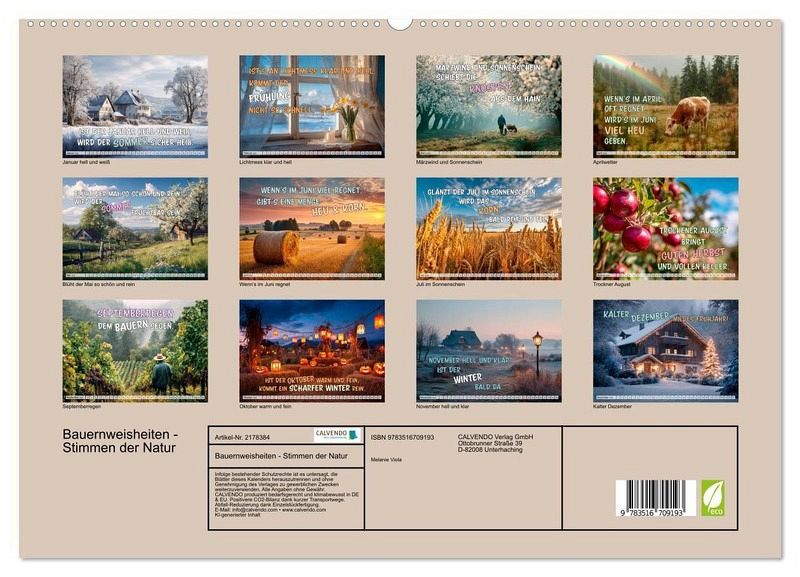 Erleben Sie Bauernregeln in neuem Glanz. Dieser hochwertige Wandkalender verbindet traditionelle Sprichwörter vom Land mit einzigartigen interpretierten Motiven, die mithilfe moderner KI-Technologie erschaffen wurden. Monat für Monat erwarten Sie detailreiche Naturbilder: vom frostigen Winter über blühende Felder bis hin zu sonnendurchfluteten Sommerlandschaften. Ein inspirierender Jahresbegleiter voller Charme, Tradition und Innovation.