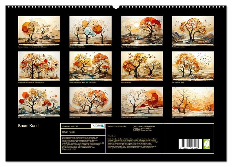 Entdecken Sie die Schönheit der Natur - neu interpretiert mit diesem Baum-Kalender. Tauchen Sie ein in die Welt kunstvoll geprägter Bäume. Erleben Sie die Schönheit geometrischer Kunst, bei der runde Formen und anmutige Wellen im Mittelpunkt stehen. Warme Farbtöne akzentuieren diese fantastischen Bäume, bei denen Modernität und Geometrie nahtlos ineinander übergehen. Der Fotokünstler Peter Roder hat faszinierende KI-Bilder gestaltet. Der perfekte Kalender für Kunst- und Naturliebhaber.