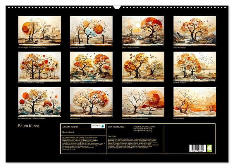 Entdecken Sie die Schönheit der Natur - neu interpretiert mit diesem Baum-Kalender. Tauchen Sie ein in die Welt kunstvoll geprägter Bäume. Erleben Sie die Schönheit geometrischer Kunst, bei der runde Formen und anmutige Wellen im Mittelpunkt stehen. Warme Farbtöne akzentuieren diese fantastischen Bäume, bei denen Modernität und Geometrie nahtlos ineinander übergehen. Der Fotokünstler Peter Roder hat faszinierende KI-Bilder gestaltet. Der perfekte Kalender für Kunst- und Naturliebhaber.