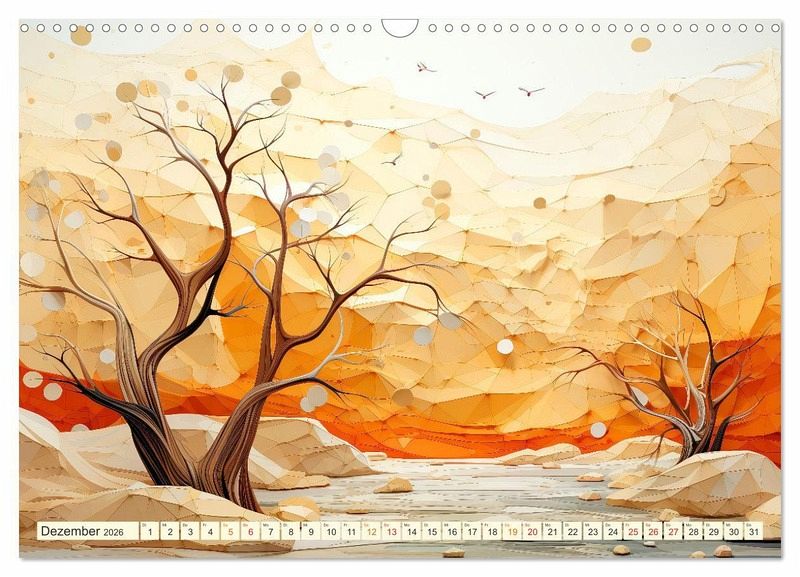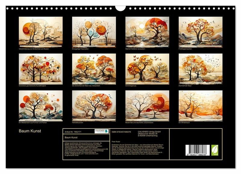 Entdecken Sie die Schönheit der Natur - neu interpretiert mit diesem Baum-Kalender. Tauchen Sie ein in die Welt kunstvoll geprägter Bäume. Erleben Sie die Schönheit geometrischer Kunst, bei der runde Formen und anmutige Wellen im Mittelpunkt stehen. Warme Farbtöne akzentuieren diese fantastischen Bäume, bei denen Modernität und Geometrie nahtlos ineinander übergehen. Der Fotokünstler Peter Roder hat faszinierende KI-Bilder gestaltet. Der perfekte Kalender für Kunst- und Naturliebhaber.