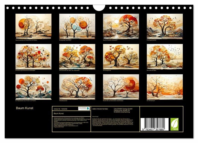 Entdecken Sie die Schönheit der Natur - neu interpretiert mit diesem Baum-Kalender. Tauchen Sie ein in die Welt kunstvoll geprägter Bäume. Erleben Sie die Schönheit geometrischer Kunst, bei der runde Formen und anmutige Wellen im Mittelpunkt stehen. Warme Farbtöne akzentuieren diese fantastischen Bäume, bei denen Modernität und Geometrie nahtlos ineinander übergehen. Der Fotokünstler Peter Roder hat faszinierende KI-Bilder gestaltet. Der perfekte Kalender für Kunst- und Naturliebhaber.