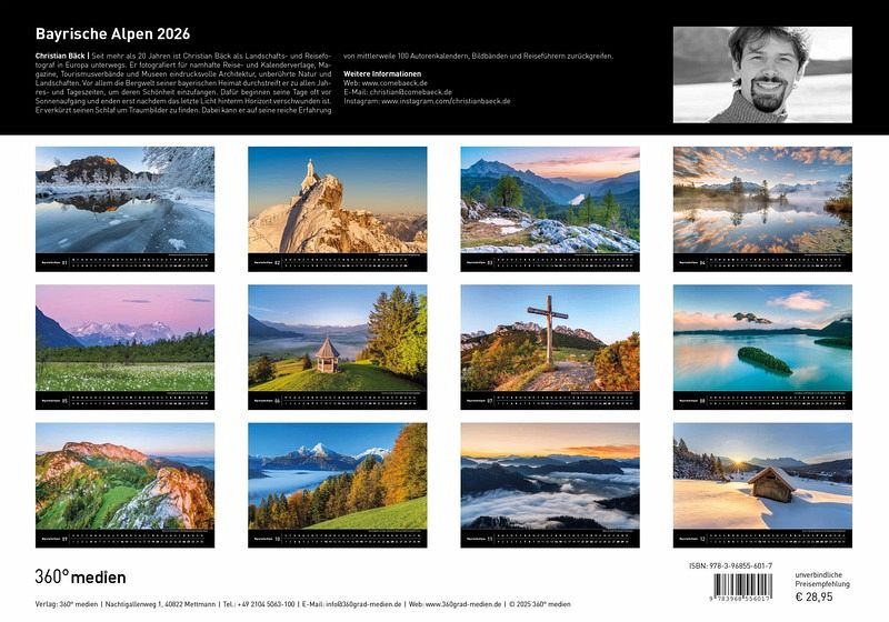 Seit mehr als 20 Jahren ist Christian Bäck als Landschafts- und Reisefotograf in Europa unterwegs. Er fotografiert für namhafte Reise- und Kalenderverlage, Magazine, Tourismusverbände und Museen eindrucksvolle Architektur, unberührte Natur und Landschaften. Vor allem die Bergwelt seiner bayerischen Heimat durchstreift er zu allen Jahres- und Tageszeiten, um deren Schönheit einzufangen. Dafür beginnen seine Tage oft vor Sonnenaufgang und enden erst nachdem das letzte Licht hinterm Horizont verschwunden ist. Er verkürzt seinen Schlaf, um Traumbilder zu finden. Dabei kann er auf seine reiche Erfahrung von mittlerweile 100 Autorenkalendern, Bildbänden und Reiseführern zurückgreifen.