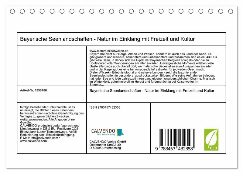 QUALITÄT - Hochwertiger Fotokalender mit 12 wunderschönen Motiven auf lichtbeständigem Bilderdruckpapier, robuste Spiralbindung.NACHHALTIG - deutliche Abfallreduzierung durch bedarfsgerechte Einzelstückfertigung, umweltfreundliches FSC-zertifiziertes Papier, Produktion in Deutschland, klimabewusste Logistik.PERFEKTES GESCHENK - Kalender für Freunde und Familie, für Kinder und Erwachsene, jung und alt, zu Weihnachten, Geburtstag oder zwischendurch.VIELFALT - Bildkalender in verschiedenen Formaten, z.B. DIN A5, DIN A4, DIN A3 sowie DIN A2. Ob Naturmotiv, Gemälde oder Fotos, ideal für ein persönliches Wohlfühlambiente.Bayern empfängt seine zahlreichen Gäste mit üppig-grünen Landschaften und zahlreichen Gewässern, die dem südöstlichen Bundesland ein idyllisches Flair verleihen. von Autor(in): Dieter Wilczek