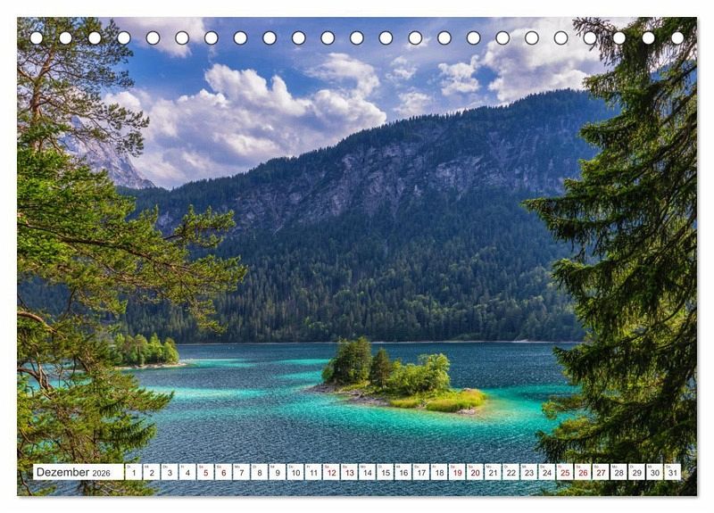 Alle Highlights sind im Kalender mit wunderschönen Fotos enthalten: Eibsee, Pfarrkirche St. Sebastian, Thumsee, Königssee, Sylvensteinspeicher, Watzmann.