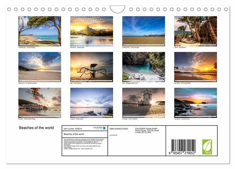 QUALITY - High-quality photo calendar with 12 beautiful images on light-resistant paper, robust spiral binding with hanger.SUSTAINABLE - Significant waste reduction due to print-on-demand production, environmentally friendly FSC-certified paper, produced in the UK, climate-conscious logistical processes.PERFECT GIFT - calendars for friends and family, for children, all ages and all occasions, from Christmas to birthdays and everything in between.LOTS OF CHOICE - Wall calendars in different sizes (DIN A4 and DIN A3), for any topic and personal taste, featuring photography, painting and illustrations.Holiday mood with beach photos from 12 different countries worldwide, author: Jan Wehnert