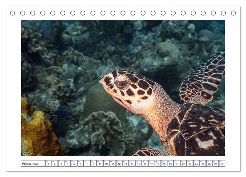 Februar: Echte Karettschildkröte schwimmt im Korallenriff