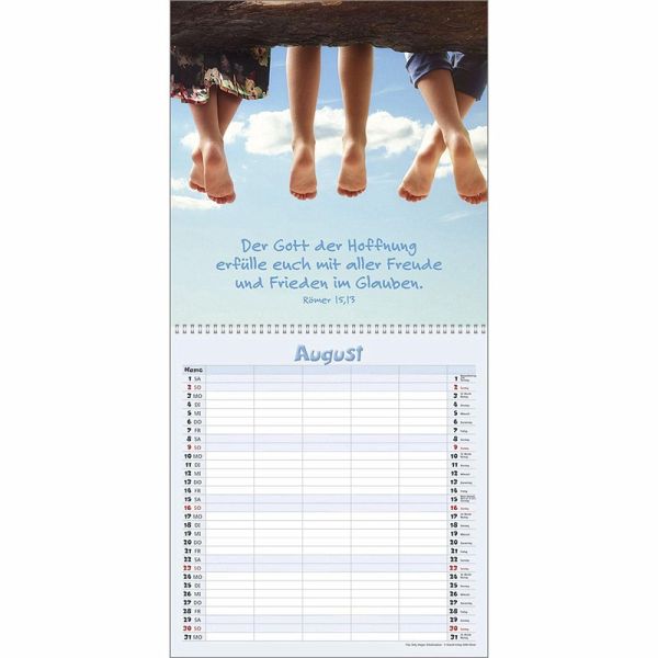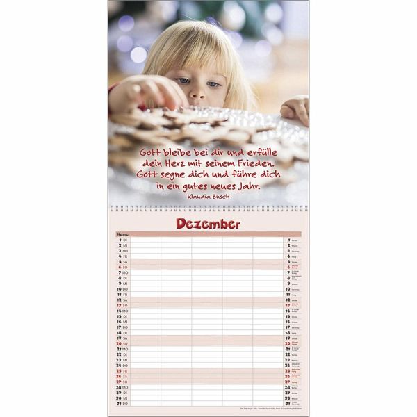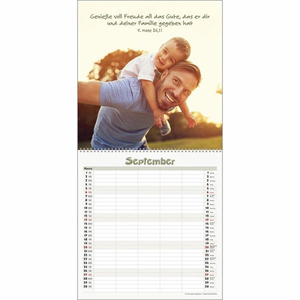 FAMILIEN-TERMINERDer Timer für die ganze Familie mit lebensnahen christlichen Texten und Bibelversen.Ein Schmuckstück an der Wand, das mit christlichen Impulsen auf Gott hinweist.DOUBLE-SIZE-Terminer:- 30 x 31 cm (aufgeklappt 62 cm)- Großer übersichtlicher Terminbereich mit fünf Spalten für "Groß und Klein"- Schulferien, Jahresübersicht auf Extra-Blatt- mit fröhlichen Menschen- und Landschaftsaufnahmen- mit Bibelworten und christlichen Texten- Übersicht, auch bei größeren Familien- 5 Spalten, gut beschreibbarUnseren XXL-FAMILIEN-TERMINER mit 7 Spalten finden Sie unter dem Titel "Bei uns ist eXtrem was los" (ISBN: 978-3-7548-28656-3)
