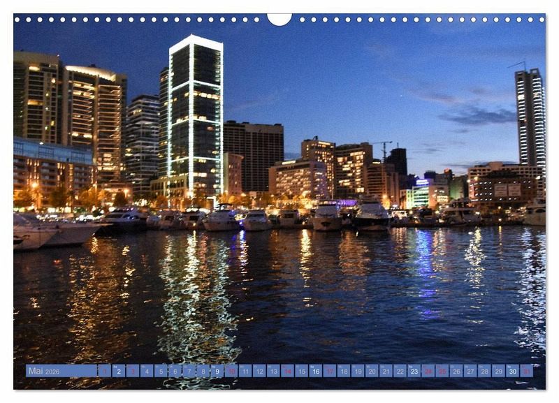 Mai: Yachthafen mit abendlich beleuchteter Skyline