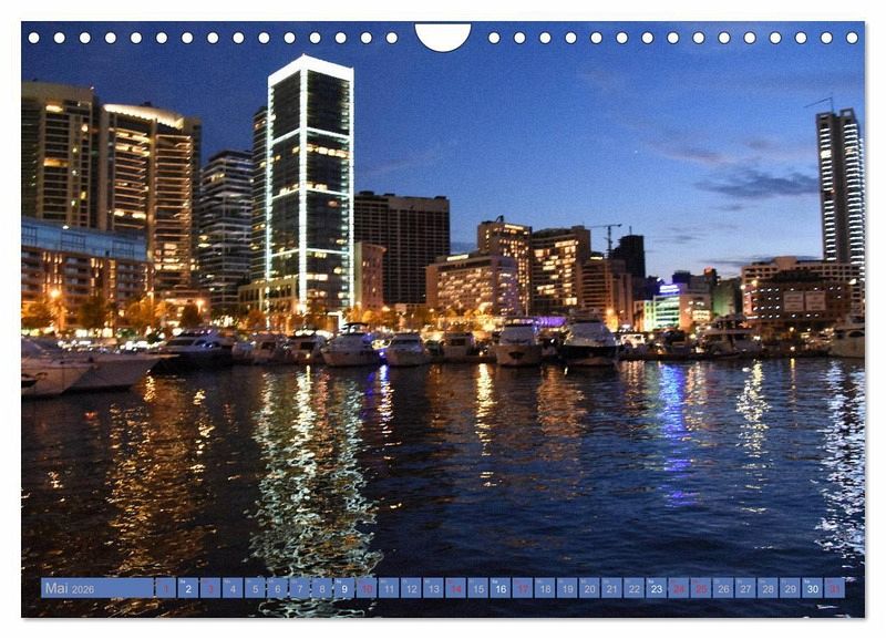 Mai: Yachthafen mit abendlich beleuchteter Skyline