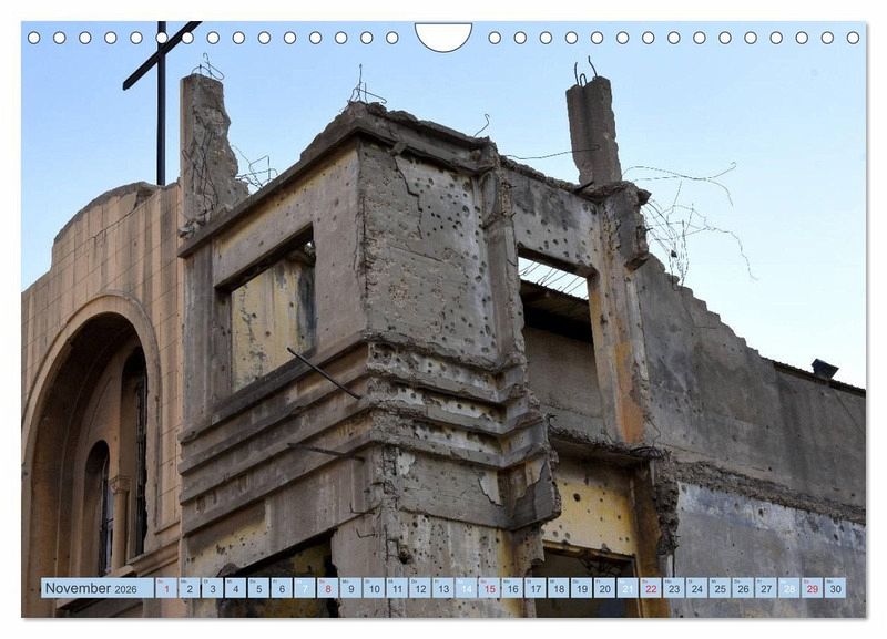 November: Ruine einer Kirche mit vielen Einschusslöchern