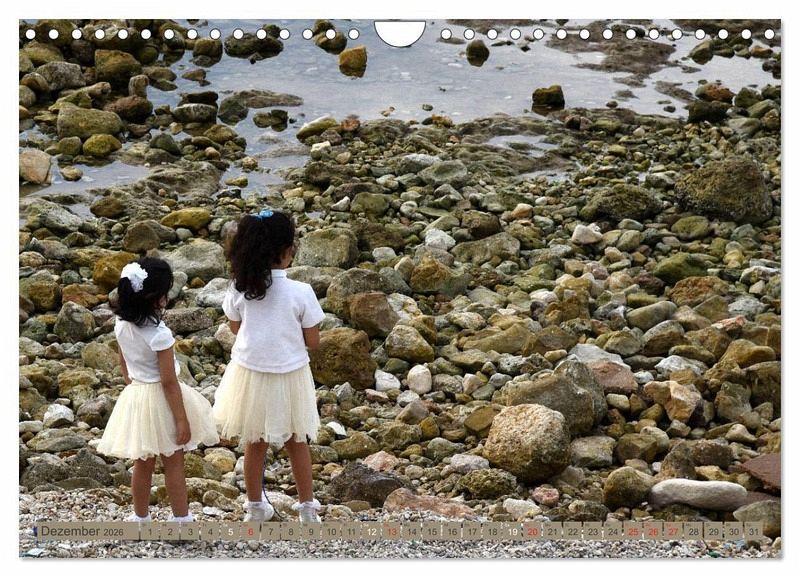 Dezember: Zwei Mädchen am steinigen Strand von Beirut