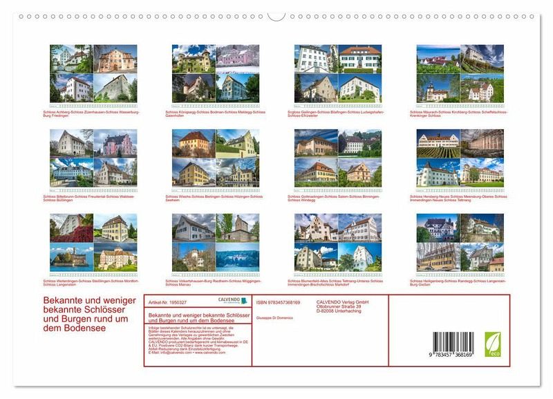 PREMIUM-LINIE - Brillanter Fotokalender mit 12 wunderschönen Motiven, Kunstdruck in Hochglanz in Museumsqualität.QUALITÄT - edle Materialien, stabile Rückwand mit 2 innovativen Einstecktaschen für eine optimale Präsentation an der Wand.NACHHALTIG - deutliche Abfallreduzierung durch bedarfsgerechte Einzelstückfertigung, umweltfreundliches FSC-zertifiziertes Papier, Produktion in Deutschland, klimabewusste Logistik.PERFEKTES GESCHENK - Kalender für Freunde und Familie, für Kinder und Erwachsene, jung und alt, zu Weihnachten, Geburtstag oder zwischendurch.Ein fotografischer Rundgang zu Schlösser und Burgen im näheren Umkreis des Bodensees von Autor(in): Giuseppe Di Domenico