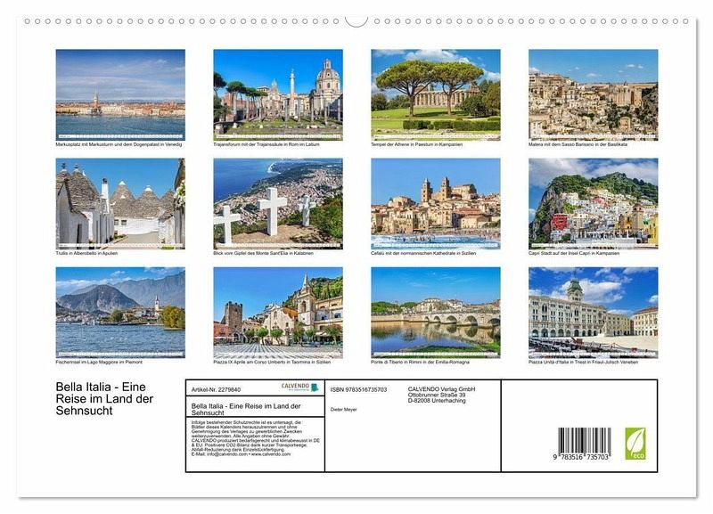 PREMIUM-LINIE - Brillanter Fotokalender mit 12 wunderschönen Motiven, Kunstdruck in Hochglanz in Museumsqualität.QUALITÄT - edle Materialien, stabile Rückwand mit 2 innovativen Einstecktaschen für eine optimale Präsentation an der Wand.NACHHALTIG - deutliche Abfallreduzierung durch bedarfsgerechte Einzelstückfertigung, umweltfreundliches FSC-zertifiziertes Papier, Produktion in Deutschland, klimabewusste Logistik.PERFEKTES GESCHENK - Kalender für Freunde und Familie, für Kinder und Erwachsene, jung und alt, zu Weihnachten, Geburtstag oder zwischendurch.Eine Reise durch Landschaften und Städte Italiens zwischen dem Norden Italiens und Sizilien. von Autor(in): Dieter Meyer