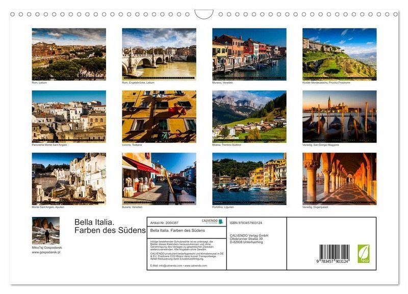 QUALITÄT - Hochwertiger Fotokalender mit 12 wunderschönen Motiven auf lichtbeständigem Bilderdruckpapier, robuste Spiralbindung mit Aufhängebügel.NACHHALTIG - deutliche Abfallreduzierung durch bedarfsgerechte Einzelstückfertigung, umweltfreundliches FSC-zertifiziertes Papier, Produktion in Deutschland, klimabewusste Logistik.PERFEKTES GESCHENK - Kalender für Freunde und Familie, für Kinder und Erwachsene, jung und alt, zu Weihnachten, Geburtstag oder zwischendurch.VIELFALT - Bildkalender in verschiedenen Formaten, z.B. DIN A5, DIN A4, DIN A3 sowie DIN A2. Ob Naturmotiv, Gemälde oder Fotos, ideal für ein persönliches Wohlfühlambiente.Originelle und überraschende Fotos aus Italien von Autor(in): Gospodarek Mikolaj