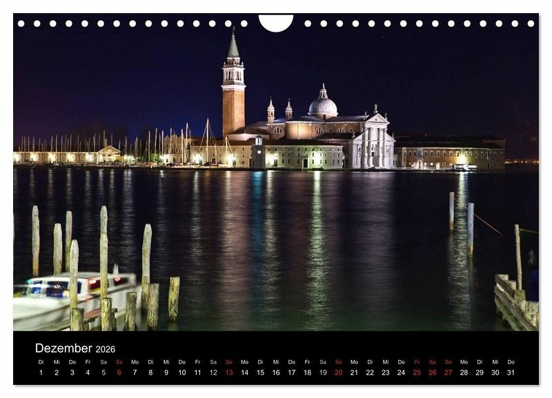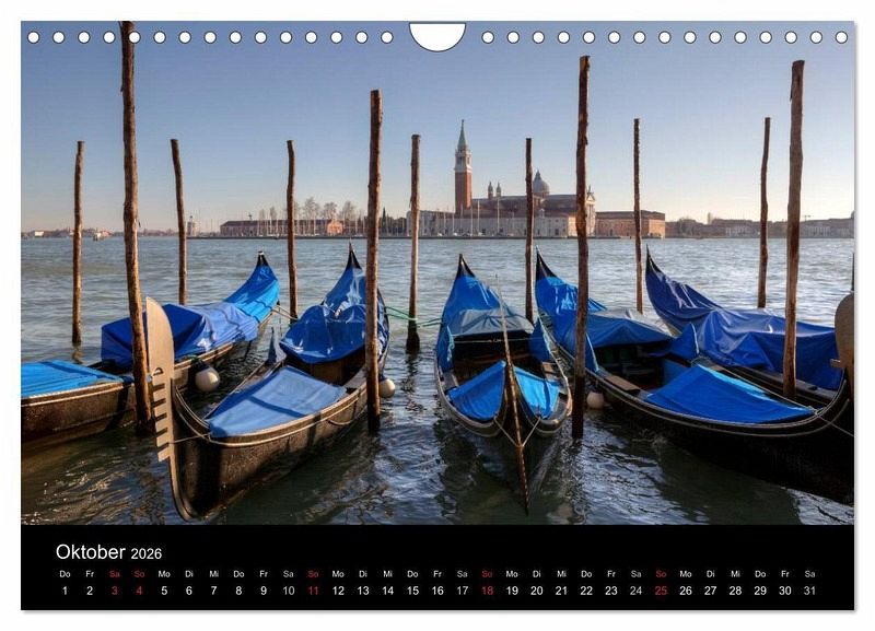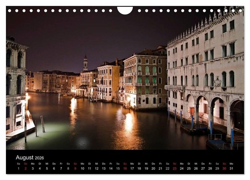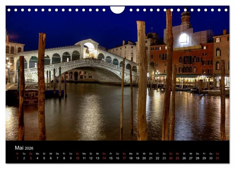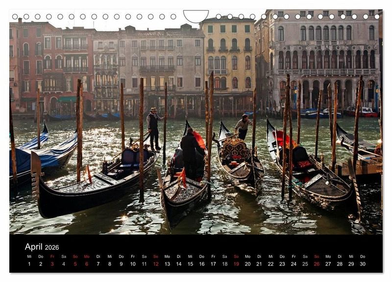 Die Lagunenstadt Venedig ist mit seiner speziellen Architektur einzigartig auf der Welt. Auf vielen kleinen Inseln in der venezianischen Lagunenlandschaft gebaut, stehen dort prunkvolle Paläste, eingerahmt von Kanälen. Unvergesslich eine Gondelfahrt über den Canal Grande. Kirchen wie Santa Maria della Salute oder San Giorgio Maggiore überragen majestätisch die Lagunenstadt. Kunstvoll gebaute Brücken wie die Rialtobrücke und die Seufzerbrücke gelten als Wahrzeichen von Venedigs. An jeder Ecke findet man malerische kleine Gassen, romantische Kanäle und typische venezianische Häuser. Dieser Fotokalender lädt Sie zu einem Spaziergang durch Bella Venezia ein.