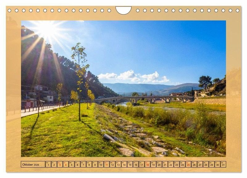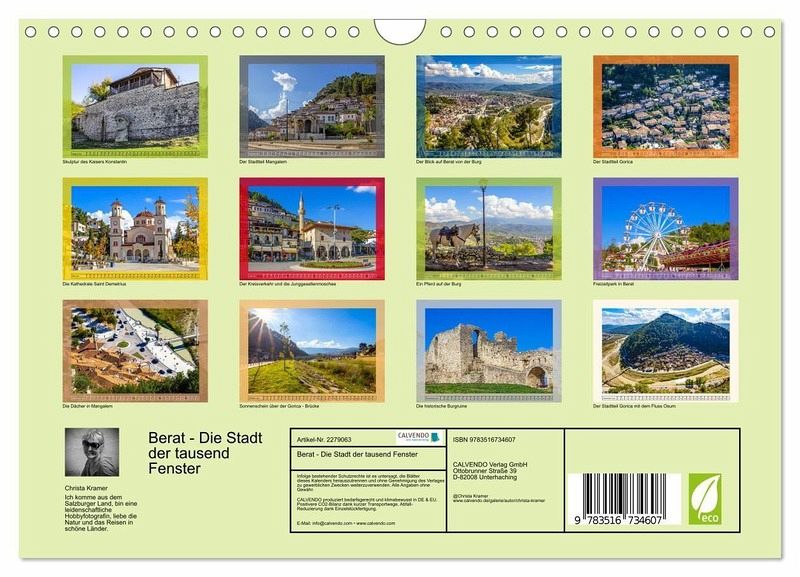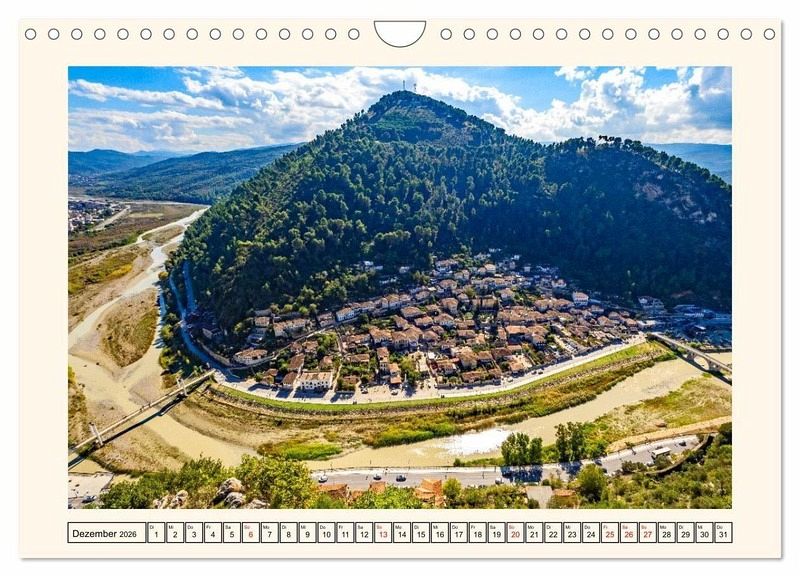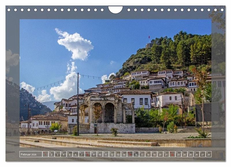 Berat, die strahlende "Stadt der tausend Fenster", verzaubert mit ihrem einzigartigen Zusammenspiel aus Licht, Geschichte und Kultur. Eingebettet zwischen sanften Hügeln und dem Fluss Osum erhebt sich die jahrhundertealte Stadt mit ihren weißen Steinhäusern, die sich malerisch an den Hang schmiegen. Enge Gassen, byzantinische Kirchen und osmanische Baukunst erzählen Geschichten vergangener Zeiten. Dieser Kalender lädt dazu ein, das historische Herz Albaniens zu entdecken - ein Ort, an dem Vergangenheit und Gegenwart in poetischem Gleichklang aufeinandertreffen.