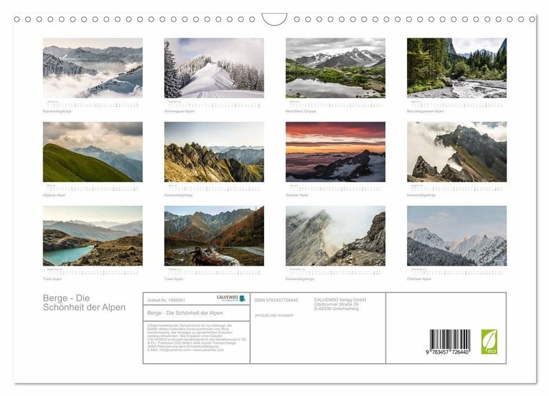 QUALITÄT - Hochwertiger Fotokalender mit 12 wunderschönen Motiven auf lichtbeständigem Bilderdruckpapier, robuste Spiralbindung mit Aufhängebügel.NACHHALTIG - deutliche Abfallreduzierung durch bedarfsgerechte Einzelstückfertigung, umweltfreundliches FSC-zertifiziertes Papier, Produktion in Deutschland, klimabewusste Logistik.PERFEKTES GESCHENK - Kalender für Freunde und Familie, für Kinder und Erwachsene, jung und alt, zu Weihnachten, Geburtstag oder zwischendurch.VIELFALT - Bildkalender in verschiedenen Formaten, z.B. DIN A5, DIN A4, DIN A3 sowie DIN A2. Ob Naturmotiv, Gemälde oder Fotos, ideal für ein persönliches Wohlfühlambiente.Eine Reise durch die Bergwelt von Autor(in): Jacqueline Wagner