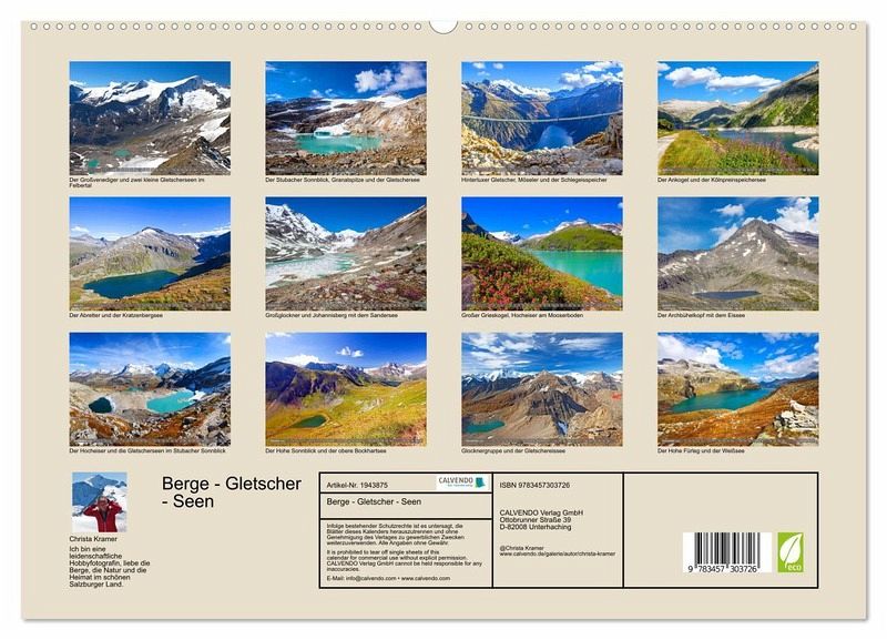 PREMIUM-LINIE - Brillanter Fotokalender mit 12 wunderschönen Motiven, Kunstdruck in Hochglanz in Museumsqualität.QUALITÄT - edle Materialien, stabile Rückwand mit 2 innovativen Einstecktaschen für eine optimale Präsentation an der Wand.NACHHALTIG - deutliche Abfallreduzierung durch bedarfsgerechte Einzelstückfertigung, umweltfreundliches FSC-zertifiziertes Papier, Produktion in Deutschland, klimabewusste Logistik.PERFEKTES GESCHENK - Kalender für Freunde und Familie, für Kinder und Erwachsene, jung und alt, zu Weihnachten, Geburtstag oder zwischendurch.Imposante Eindrücke unserer Berge, Gletscher und Seen in Österreichs Alpen von Autor(in): Christa Kramer