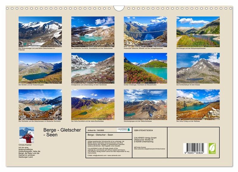 QUALITÄT - Hochwertiger Fotokalender mit 12 wunderschönen Motiven auf lichtbeständigem Bilderdruckpapier, robuste Spiralbindung mit Aufhängebügel.NACHHALTIG - deutliche Abfallreduzierung durch bedarfsgerechte Einzelstückfertigung, umweltfreundliches FSC-zertifiziertes Papier, Produktion in Deutschland, klimabewusste Logistik.PERFEKTES GESCHENK - Kalender für Freunde und Familie, fürKinder und Erwachsene, jung und alt, zu Weihnachten, Geburtstag oder zwischendurch.VIELFALT - Bildkalender in verschiedenen Formaten, z.B. DIN A5, DIN A4, DIN A3 sowie DIN A2. Ob Naturmotiv, Gemälde oder Fotos, ideal für ein persönliches Wohlfühlambiente.Imposante Eindrücke unserer Berge, Gletscher und Seen in Österreichs Alpen von Autor(in): Christa Kramer