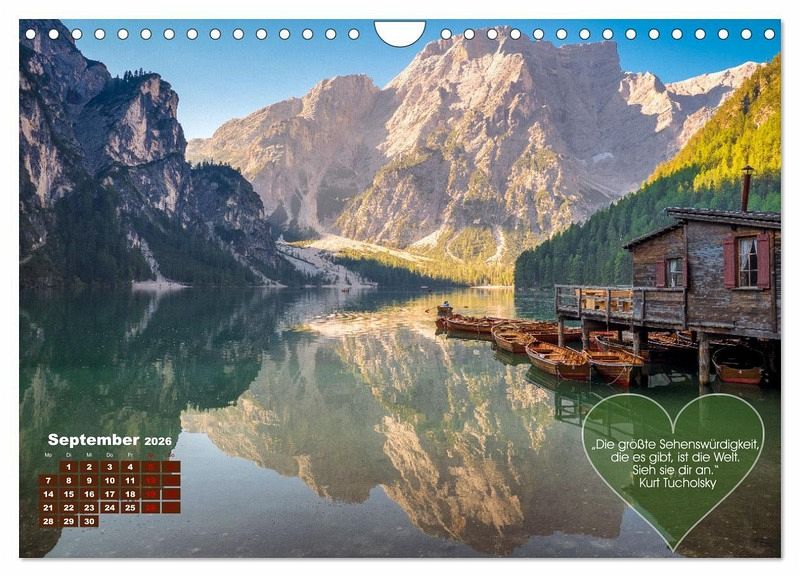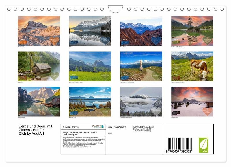 Dieser Kalender ist nicht nur ein wunderschöner Wandschmuck, sondern ein wunderbares Geschenk für Menschen die Zitate mögen. Er enthält 12 kunstvoll arrangierte Fotografien von beeindruckenden Berge und wunderschönen Seen. In jedem Kalender von VogtArt steckt meine Liebe zur Natur, zum Detail und zu Farbkompositionen.